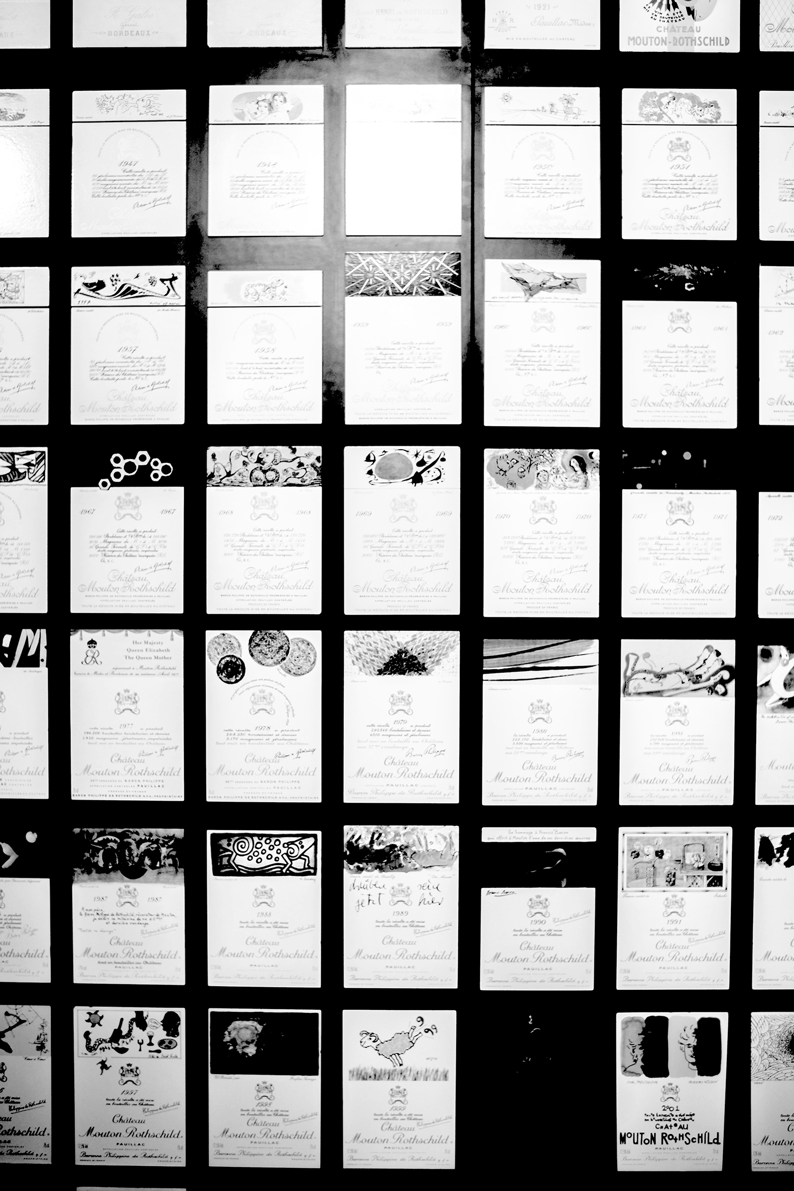 Talk of Venet brings us neatly back to Mouton-Rothschild and its labels, undeniably the best-known wine and art association in existence. This association can be traced back as far as the 1924 label, designed by Jean Carlu (1900 - 1997), although it was the V for Victory label, commissioned to mark the end of World War II in 1945, which kick-started the annually renewed artist's label. That first label was the work of Philippe Jullian (1919 - 1977), but since then the labels have featured original and reproduced works of art by Dali, Bacon, Picasso and other luminaries..